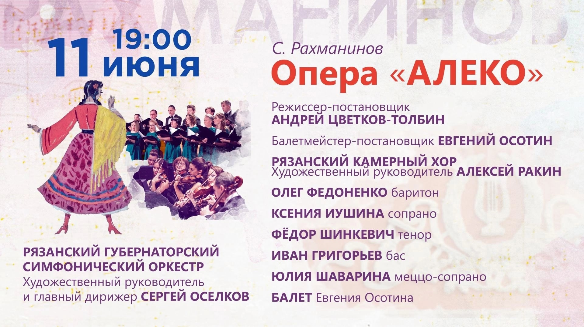 В связи с неблагоприятными погодными условиями– температурой ниже 16°C сценическая постановка оперы Сергея Рахманинова «Алеко» переносится в концертный зал филармонии. ВХОД СВОБОДНЫЙ. Встречаемся 11 июня в 19:00!