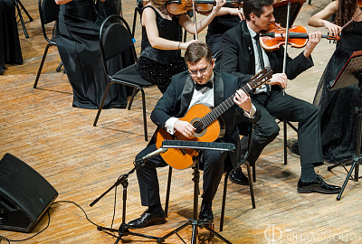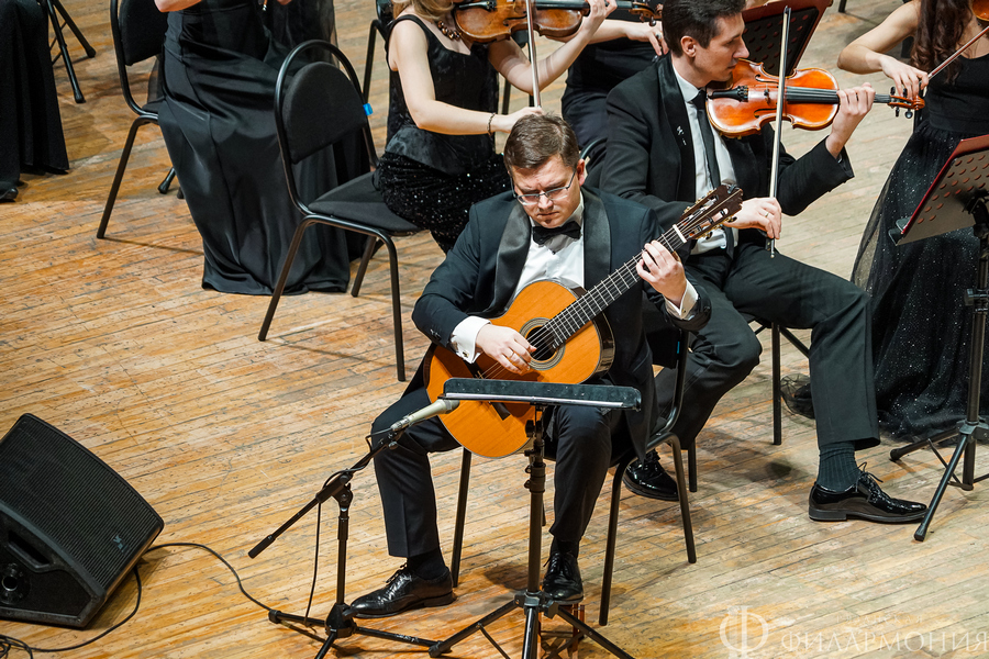 В первом отделении прозвучали Концерт для кларнета с оркестром Бориса Чайковского (солист Сергей Мунинкин, кларнет) и Концерт для гитары с оркестром Александра Чайковского (солист Дмитрий Бородаев, гитара).